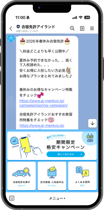 一般公開される前の期間限定キャンペーンや、公式LINE登録者向けの特別な情報をいち早くお届けします。不定期で「キャンセル空き情報」が配信されることもあるため、友達追加しておくだけで、諦めていた人気校の枠を再発見できるチャンスが広がります。